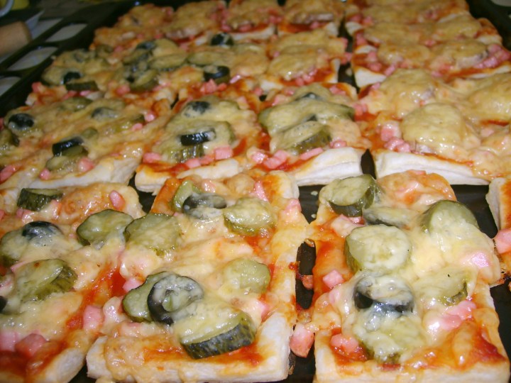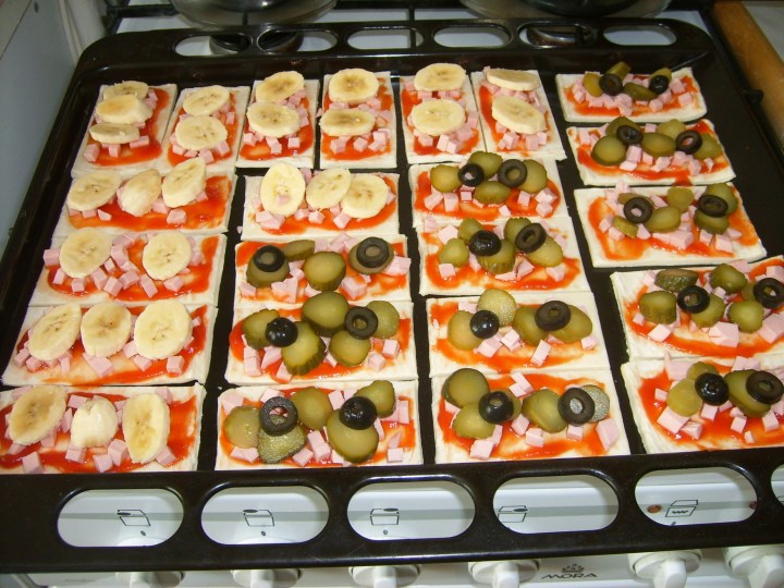 Tešlą šiek tiek atšildom, lakštus supjaustom kiek mažesniais gabaliukais. Juos patepam pomidorų padažu ir apibarstom kubeliais supjaustyta mėsyte. Tada ant pusės piciukų dedam rauginto agurko ir alyvuogių riekutes, o ant kitos pusės – banano gabaliukus.