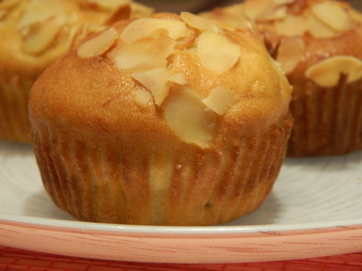 Tada ateina eilė miltams, kepimo milteliams ir vaniliniam cukrui. Viską vėl išmaišom. Į tešlą sudedam razinas ir “burokine“ tarka sutarkuotą bananą. Dar kartą pamaišom, tešlą kraunam į keksiukų formeles, apdedam migdolų drožlėm ir kišam į kokių 200 laipsnių karštumo orkaitę. Kepam tol, kol iškepa. Man reikėjo maždaug 40 minučių. 🙂