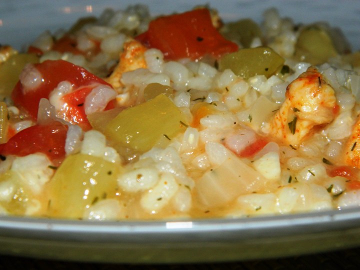 Kol ryžiai troškinosi, į keptuvę sumečiau ir nublanširuotą ir susmulkintą pomidorą. Barsčiau prieskoniais. Kai jau viskas išsitroškino, sudėjau vištienos gabaliukus, tarkuotą Čederio sūrį ir gerai išmaišiau. Viskas! 🙂